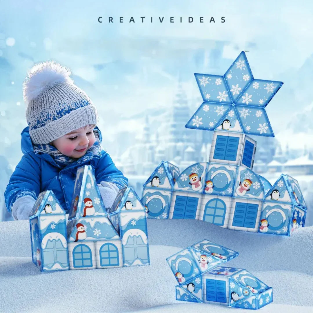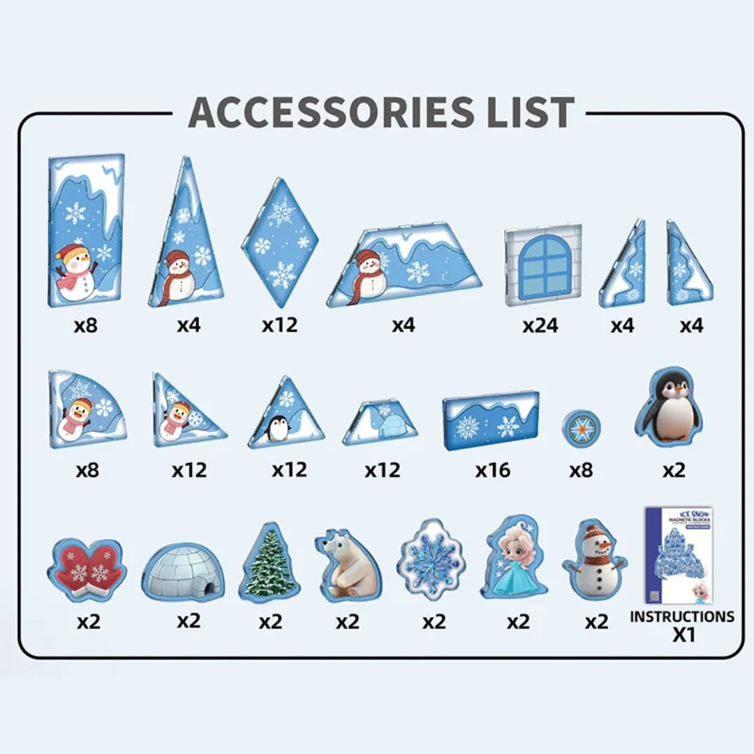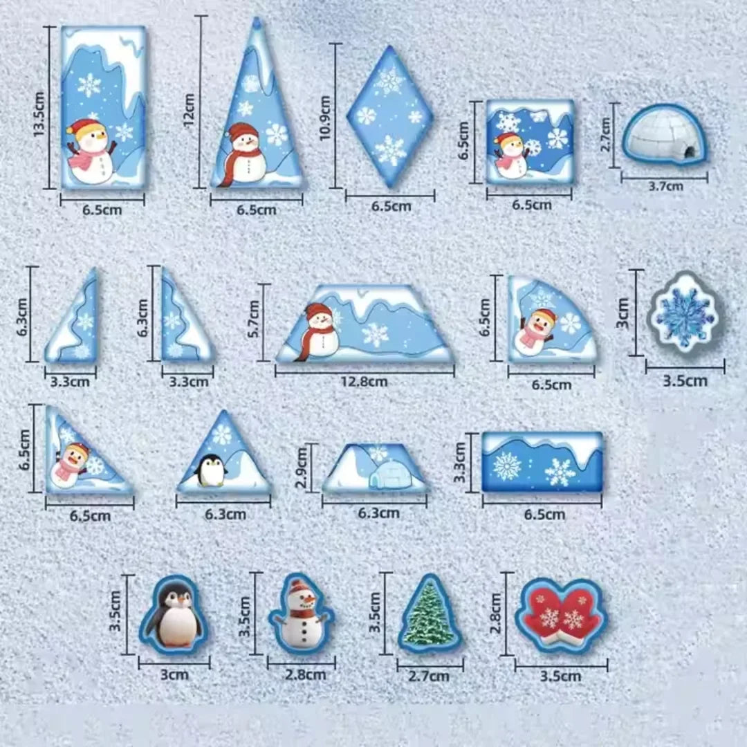 مجموعة إبداعية مكونة من 144 قطعة بتصاميم ملونة لرجال الثلج، البطاريق، والثلوج، تتيح للأطفال بناء قلاع ومجسمات خيالية مستوحاة من عالم الشتاء.